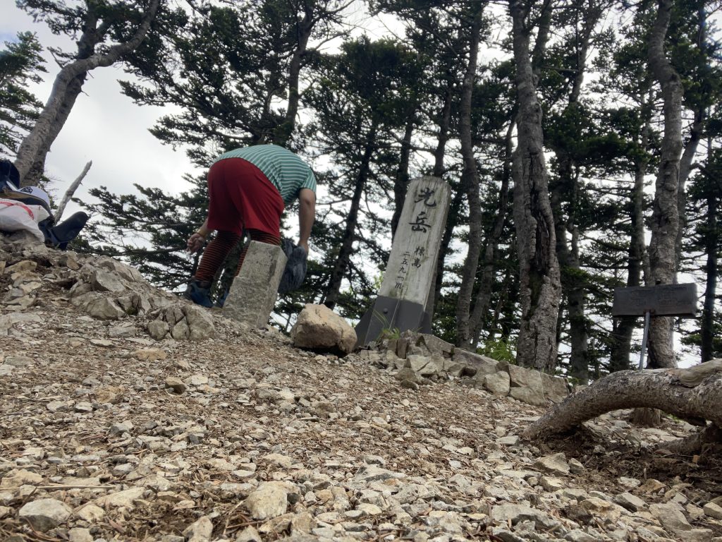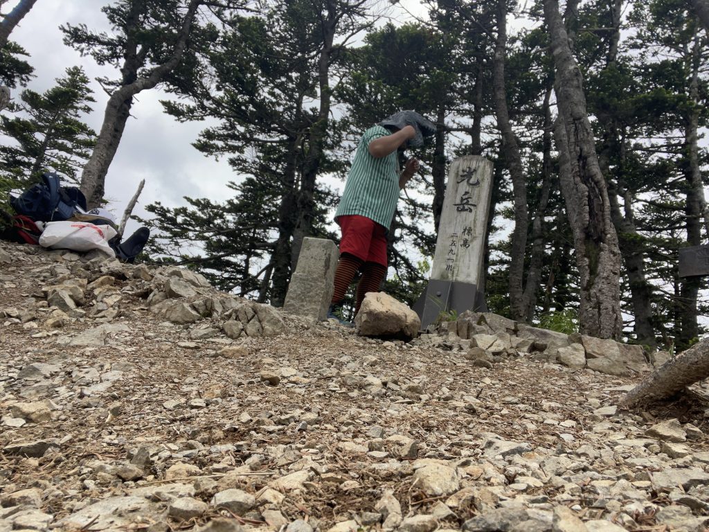 塩見岳は2つのコブからなっていて、低い方の西峰(3047m)に二等三角点がある。大展望が広がる中で、特に大井川東俣の谷を挟んで農鳥岳から南下する尾根上に、広河内岳、白河内岳、黒河内岳という山々が美しい稜線を見せている。