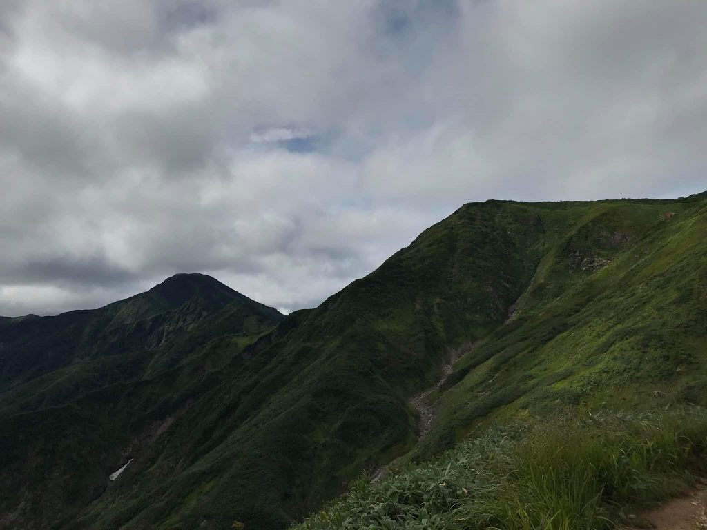 小倉山を過ぎて少し歩くと登り勾配が急になり始め、そのうちに森林限界を超えて気持ちい稜線歩き区間になります。同時に山頂直下の山肌が目前に迫る迫力のある景色を楽しめます。振り返れば周囲の山々の景観を楽しむこともでき、爽快な稜線歩きです。この時期でもわずかに残雪が残っているあたり、さすが豪雪の山だなぁと感じます。