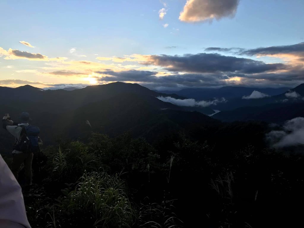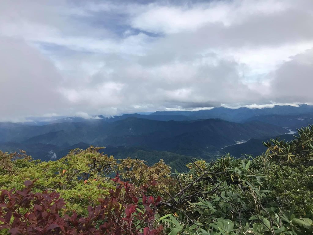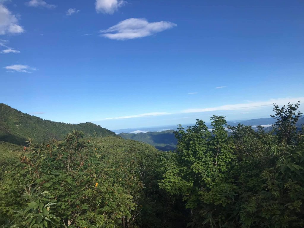 山頂直下の稜線にでると魚沼平野方面からガスが流れてきたり、消えたりの繰り返し。でも景色は十分に楽しめ、八海山の八ツ峰、枝折峠ヒルクライム(私も出場したことがある自転車レース)でおなじみの樹海ライン、奥只見の山々などの景色が楽しめました。前回はガスで何も見えなかったので大満足です。30分弱滞在して、さすがに冷えてきたので駒の小屋へ下り、トイレを利用させてもらって下山しました。