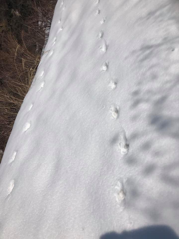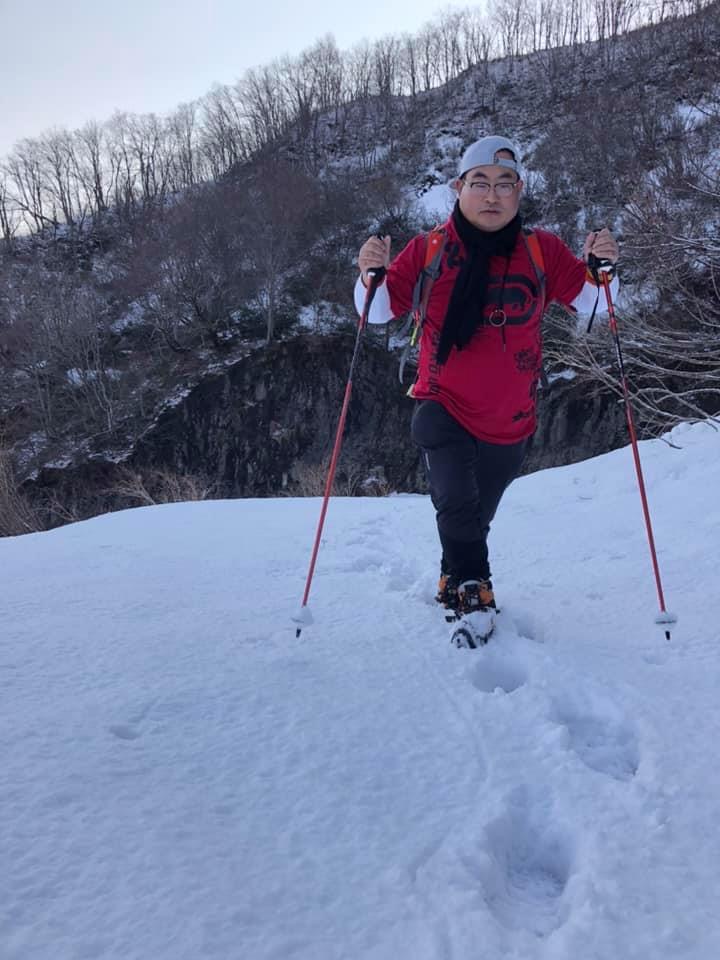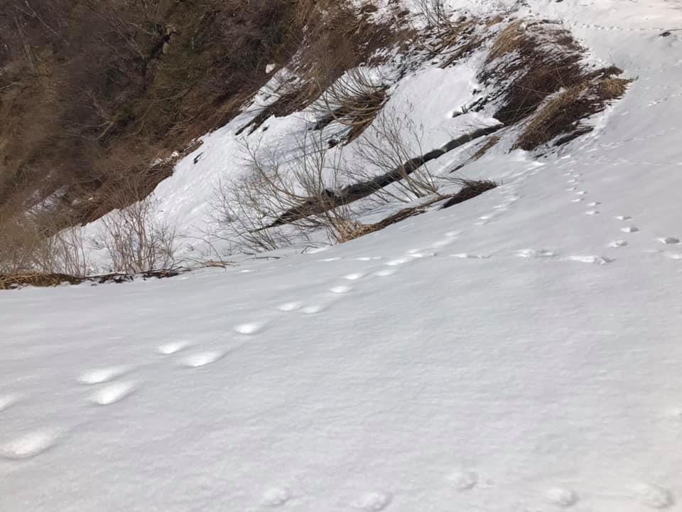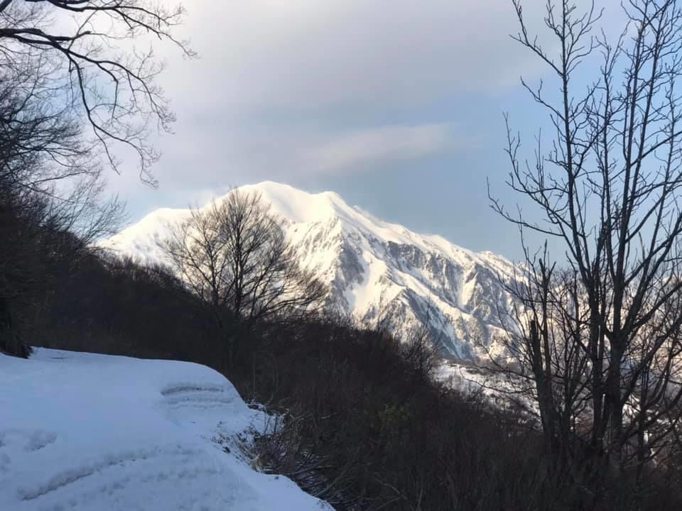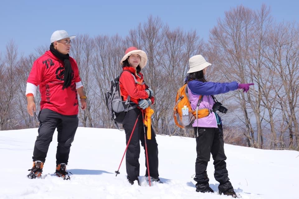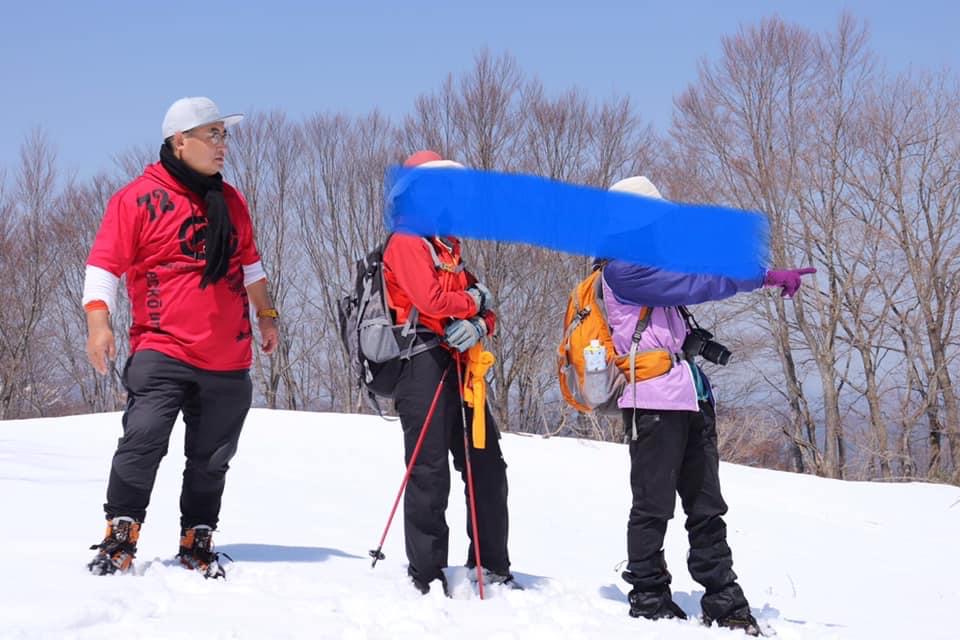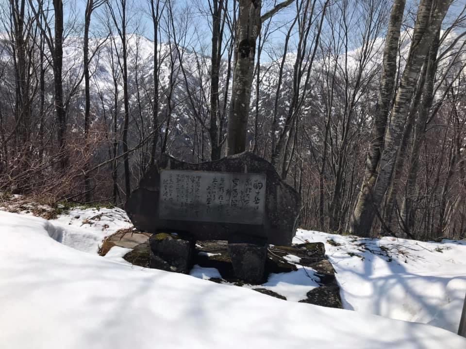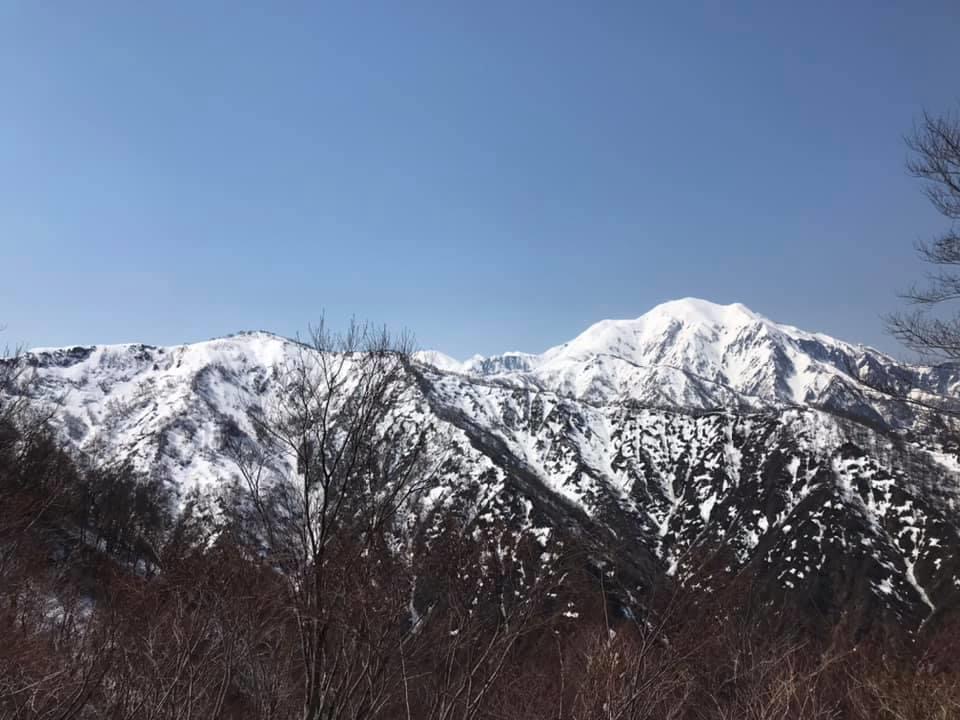 小倉山を過ぎて少し歩くと登り勾配が急になり始め、そのうちに森林限界を超えて気持ちい稜線歩き区間になります。同時に山頂直下の山肌が目前に迫る迫力のある景色を楽しめます。振り返れば周囲の山々の景観を楽しむこともでき、爽快な稜線歩きです。この時期でもわずかに残雪が残っているあたり、さすが豪雪の山だなぁと感じます。