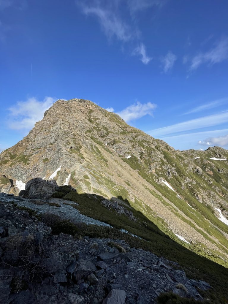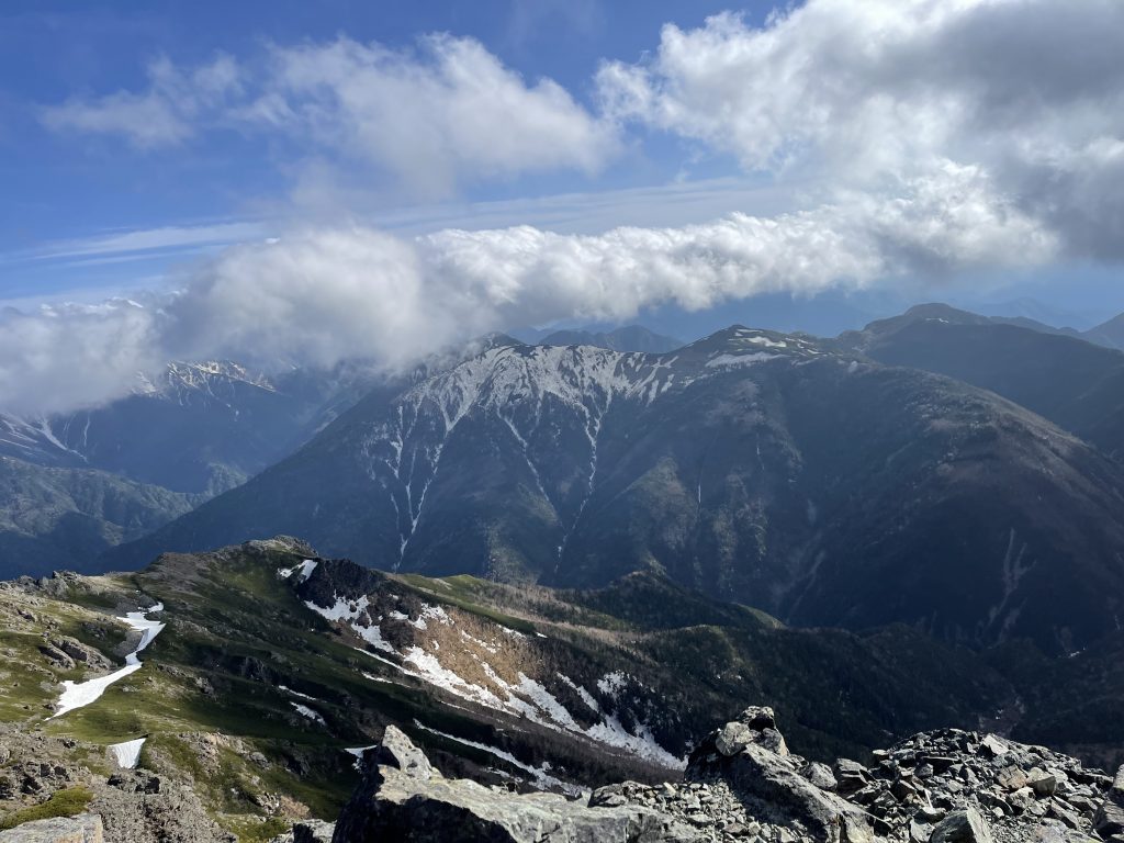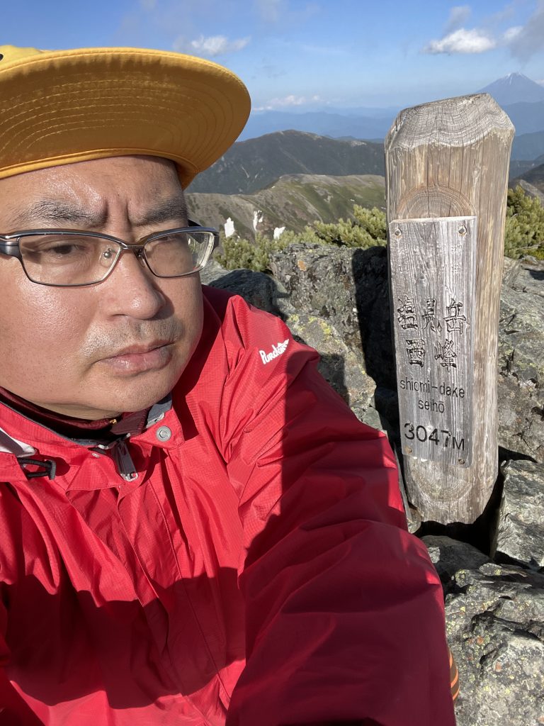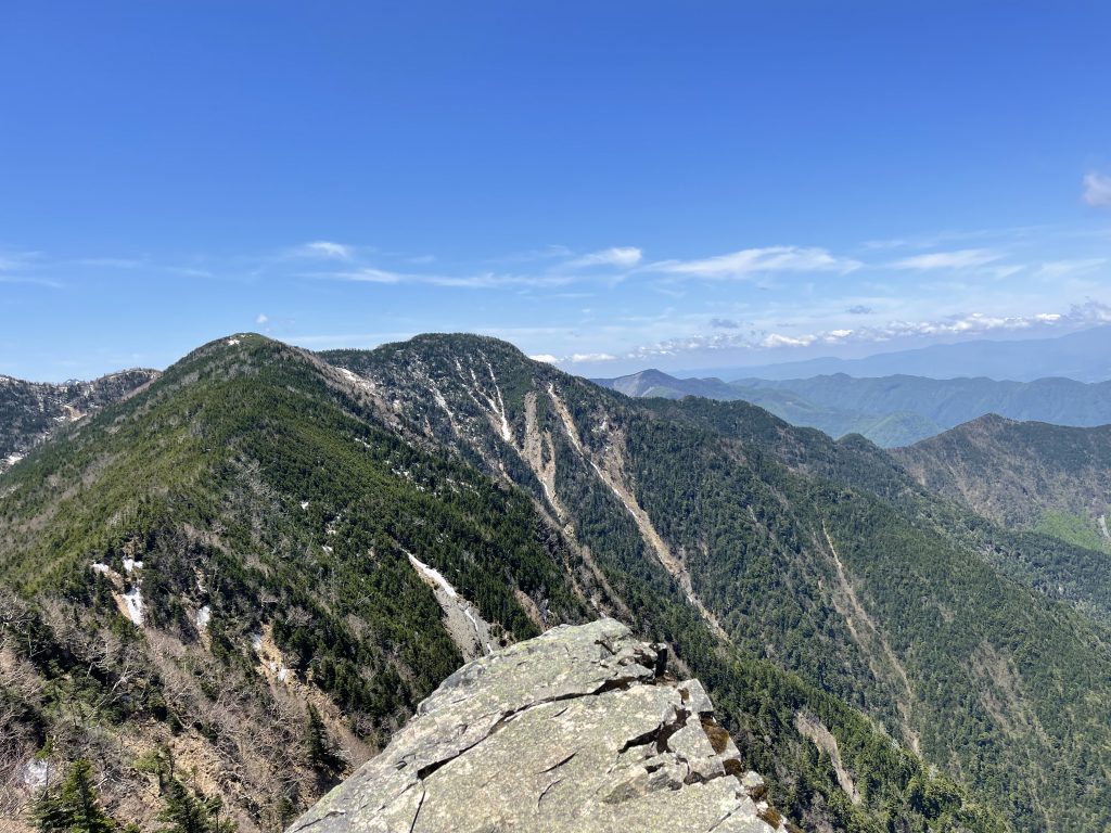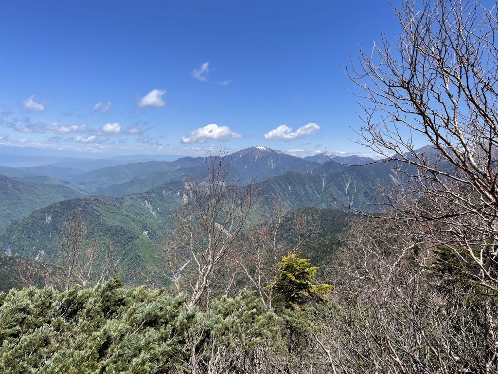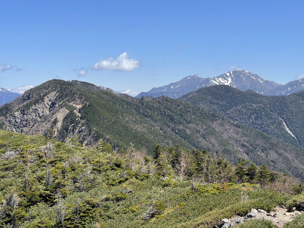 塩見岳は2つのコブからなっていて、低い方の西峰(3047m)に二等三角点がある。大展望が広がる中で、特に大井川東俣の谷を挟んで農鳥岳から南下する尾根上に、広河内岳、白河内岳、黒河内岳という山々が美しい稜線を見せている。