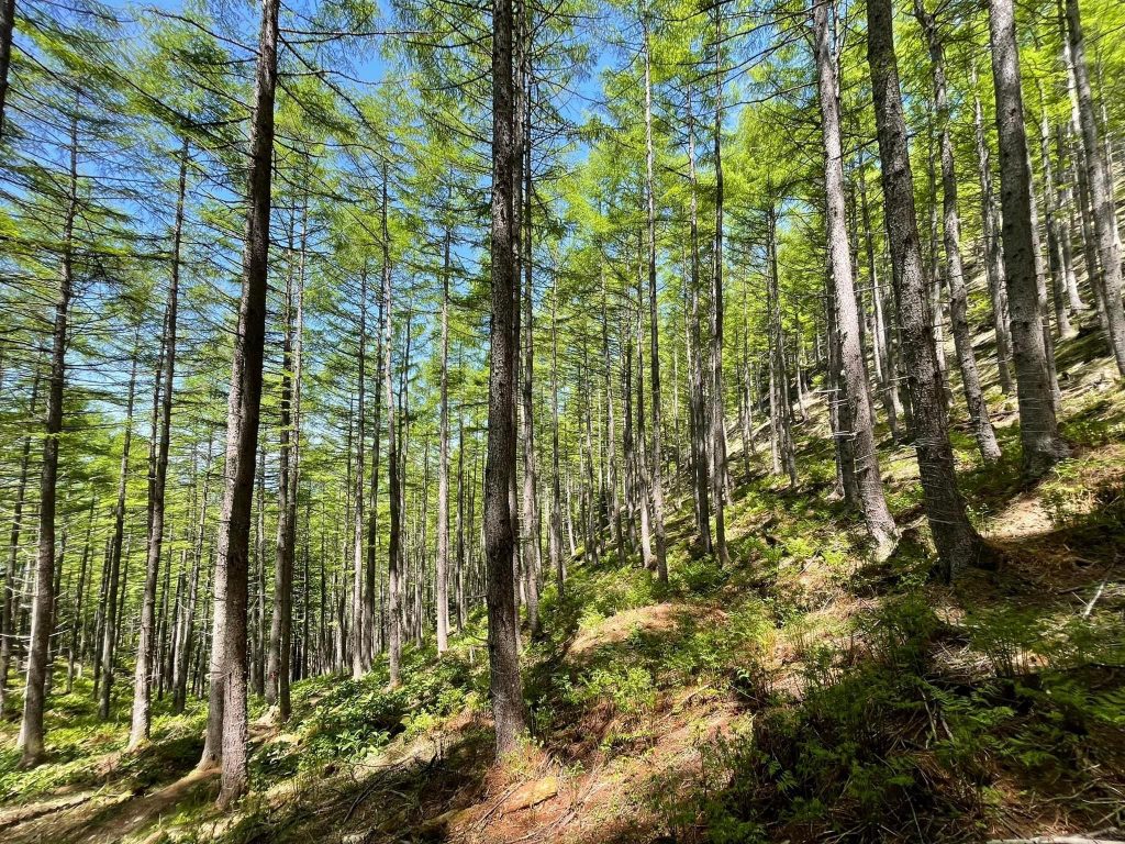 塩見岳に短時間で登りたいという人に、自家用車を使って塩見岳の裏側から入る、とっておきのコースを紹介する。まずは三峰川の上流、小瀬戸ノ湯を目指す。以前は小瀬戸ノ湯近くにゲートがあったが、現在はさらに上流へゲートを移して、利用しやすい林道になっている。5kmほど奥の巫女渕のゲートに車を残し、林道を1時間弱歩くと橋があり、登山口の標識がある。地形図で大黒沢が注いでいる所である。このコースは権右衛門山から北方に張り出した尾根に取り付くのだが、尾根に出るまでは急登でも、出てしまえば、こんな所にこんないい道があったのかと驚くばかりである。塩見小屋へは6時間もあれば十分達することができる。登りつめて行くと権右衛門山直下を左手に巻いて、小屋の少し手前で三伏峠からの道と合流する。