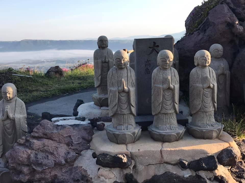 「阿蘇山」は単体の山ではなく根子岳・高岳・中岳・烏帽子岳・杵島岳などを総称した呼称で、五つの岳を総称して阿蘇五岳と呼ばれます。これら阿蘇五岳は、北側外輪山の大観峰から眺めると、 ちょうど「涅槃像ねはんぞう」のように見えることもあり、山岳修験者による信仰や民衆による「お池さん参り」としての火口参詣など、阿蘇山は古来より畏敬の対象として人々に崇められてきました。「涅槃像」として親しまれる阿蘇五岳は、夏は水田に映る逆さ阿蘇、冬は雲海など四季折々の表情が楽しめる景勝地です。